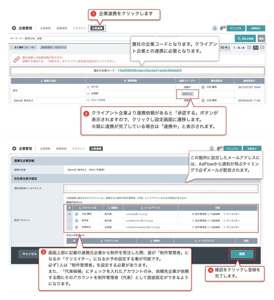 - 外部企業の AdFlow企業コード を入力