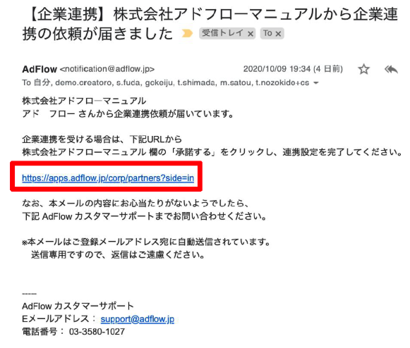 - 【企業連携】〇〇株式会社から企業連携の依頼が届きましたという件名にてメールが届く