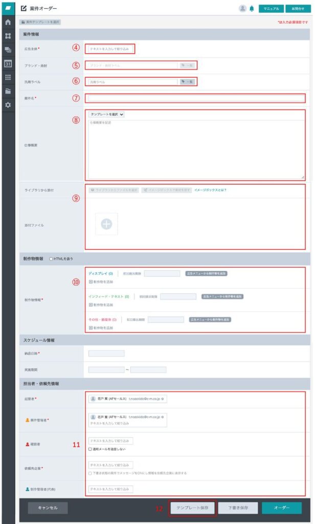 案件オーダーフォーム入力省力化、均一化(必要事項の漏れ防止)のためのテンプレート設定です。